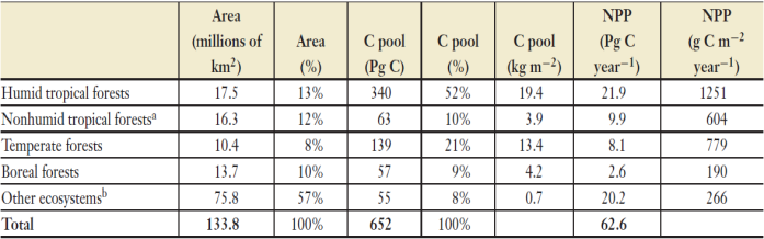 Table 1: Areal extent, carbon storage and net primary productivity of earth’s major biomes (from Roy et al, 2001).