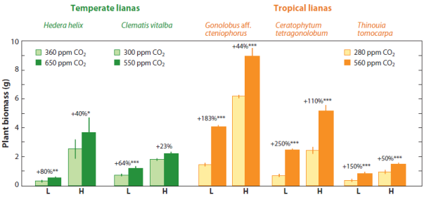 As expressed, as most tree seedlings wait to exploit an opening in the canopy, lianas employ a different strategy. Lianas are situated in deep shade and aim to occupy maximal space, but with minimal structural investment (Korner, 2009). Elevated CO2 increases the probability of lianas reaching the upper canopy. Granados and Korner (2002) studied biomass and growth rates for three liana species; simulated in a tropical understorey environment with seed and soil from Yucatan; under high and low light levels; and under ambient and elevated CO2 levels.