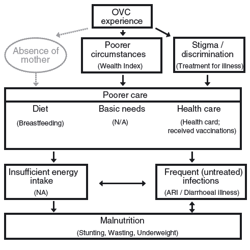 Hierarchical framework for investigating the causal pathways between OVC experience and ill-health and malnutrition. N/B The UNICEF indicators used in the analysis are shown in the brackets- where there is no appropriate indicator to fit into the framework, NA (not available) is noted under the risk factor.45
