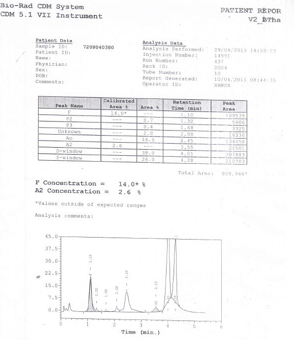 A study done on abnormal hemoglobin variants among the major ethnic groups of Karachi in 2002 showed that 60% had iron-deficiency anemia and 40% had hemolytic anemia, of which 20.6 % was due to thalassemia major, 13% thalassemia trait, 5.1% sickle cell disease, 0.76% hemoglobin D Punjab (HbD Punjab), 0.32% hemoglobin C (HbC), and 0.22% hereditary persistence of fetal hemoglobin (HPFH) (4).Hb S is the most common Hb variant, its clinical outcome is severe in homozygous or when associated with other hemoglobinopathies, such as beta-thalassemia, Hb C or Hb D. (5). A number of studies have been done on Hb S and Hb C but Hb D is still poorly studied especially in Pakistan. Hemoglobin D has several varients such as HbD Punjab (Los Angeles), Hb D Iran, Hb D Ibadan and Hb D Bushman but the most common variant is HbD-Los Angeles (also called HbD-Punjab). High performance liquid chromatography (HPLC) can be used to separate hemoglobin polypeptide chains in the laboratory. High performance liquid chromatography (HPLC) employs ion exchange method to identify and exchange various fractions of Hb.Hb D can be also distinguished from Hb S by acid electrophoresis or isoelectric focusing (IEF) (separation according to isoelectric points). On alkali electrophoresis (cellulose acetate) Hb D Punjab migrates slower than Hb A which is similar to HbS but its migration under acid electrophoresis (agarose gel) is similar to Hb A (6) In HbSD disease, HbD does not take part in the sickling process, as patients homozygous for HbD do not sickle but mild hemolytic anemia, mild to moderate splenomegaly may occur (7,8). Studies has indicated that although HbD itself does not polymerize, it increases the hydrophobic interaction between Hb S molecules and facilitates the polymerization of HbS thus enhancing the severity of the disease. (9) HbD heterozygotes with normal HbA have no clinical or hematologic alterations. (6) Table 1.1: Hb Electrophoresis : Test Done on high performance liquid chromatography (HPLC)