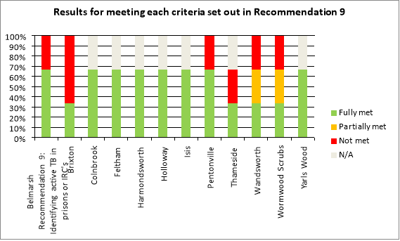The majority (90%) of the criteria’s set out in recommendation 12 (identification and management of Latent TB) are not being met across all the prisons and IRCs. Although most of the criteria’s in Recommendation 8, 9 and 10 are reported as fully met by prisons and IRCs, there appears to be important gaps in meeting some of these criteria’s, where up to 40% of the criteria’s in Recommendation 8 are either partially, unsure or not being met at all.