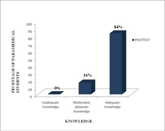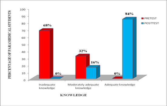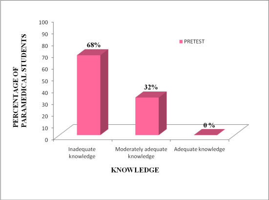 The above bar diagram shows that 34(68%) paramedical students have inadequate knowledge, 16(32%) paramedical students have moderately adequate knowledge and none of them have adequate knowledge regarding successful ventilation with I-gel and Laryngeal Mask Airway in their pretest.