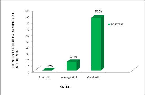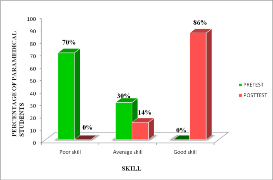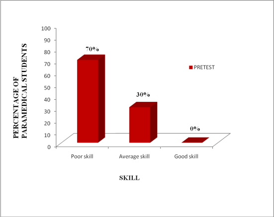 The above bar diagram shows, among 50 paramedical students none of the paramedical students have good skill, 15(30%) paramedical students have average skill and 35(70%) of them have poor skill regarding successful ventilation with I-gel and Laryngeal Mask Airway in their pretest.