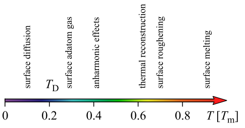 The processes that take place on a sample’s surface during the increase of the surface temperature from zero Kelvin towards the melting point temperature Tm are described below in Figure 1