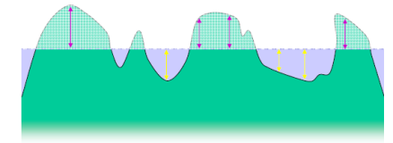 But in order to characterize more quantitatively the roughness of the surface parameters are introduced such as the root mean square or RMS roughness which is the square root of the mean of the squared distances of every single point from the mean plane and the distances are shown in Figure 3 with purple and yellow arrows. The mean plane is a reference line and functions as the separating line that divides the upper and down surface areas into two equal areas. (The total surface belonging to the grid is equal to the grey area in Figure 3).