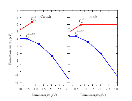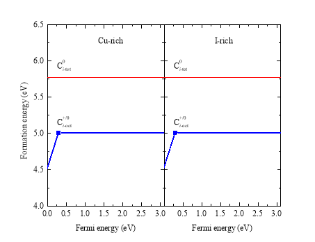 Fig.2. Formation energies for CCu and CI as a function of the Fermi level under Cu-rich and I-rich limits. For each defect species, only the lowest-energy charge states with respect to EF are shown. The zero energy of EF is taken to be the top of the valence band. The superscript and slope of the segment represent the charge states of defects.