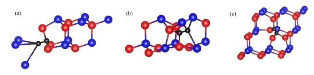Fig.1. Crystal structures of zinc-blende CuI: (a) perfect crystal, (b) tetrahedral interstitials and (c) octahedral interstitials. [Cu: red, I: blue, C: black].