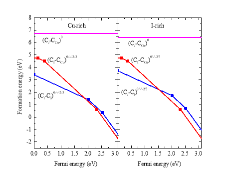 Fig.5. Formation energies for complexes as a function of the Fermi level under Cu-rich and I-rich limit. For each defect species, only the lowest-energy charge states with respect to EF are shown. The zero energy of EF is taken to be the top of the valence band. The superscript and slope of the segment represent the charge states of defects.