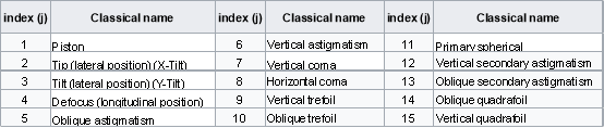 The Zernike polynomials are a sequence of polynomials that are orthogonal over circular pupils. Some of the polynomials are related to classical aberrations. In optometry and ophthalmology, Zernike polynomials are the standard way to describe aberrations of the cornea or lens from an ideal spherical shape, which result in refraction errors [WIKI].