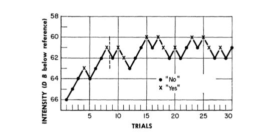 4. Under some conditions, the step-size need to be changed during the test. "For careful experimental design, the first stimulus in each of the staircases are at same intensity-level." [Cornsweet 1962] However, then the staring level would be too far from the final level. This can be avoided by using large steps at the start, and smaller steps when it approach the final level. For instance, this can be done by decrease the step from 3db to 1db at the third reversal.