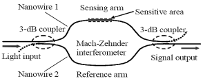 A probe light that is launched through the nanowire propagates through the first 3 dB coupler, operating as an optical splitter, which divides it between the sensing and the reference arms, and it finally recombines via the second 3 dB coupler, working as an optical combiner, as shown in Figure 5.1(a). The phase shift caused by the index change due to the specimen placed in the sensing arm is numerically calculated and evaluated from the simulated signal output of the lower nanowire, as presented in Figure 5.1(a).