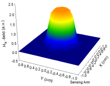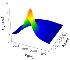 The structure supports both fundamental quasi-TE and quasi-TM modes. For the quasi-TE mode the Hy field component is dominant, and Hx and Hz are the nondominant components. The dominant Hy field component of the Hy11 mode is shown in Figure 5.12 for the waveguide width, GW = 180 nm and height, GH = 320 nm