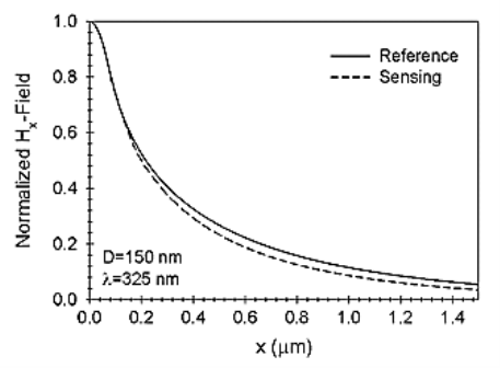 The optical field confinement in the reference and the sensing arms can be better viewed from the normalized field profile along the horizontal (x)-axis, as presented in Figure 5.3 for nanowire core diameter, D, of 150 nm. As can be seen from the earlier curves in Figure 5.3, the normalized optical fields for the reference and the sensing arms have small variation in the optical field profile.
