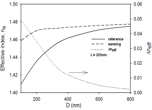 The effective index of the sensing arm is higher than the reference arm. It is due to increase of refractive index in the sensing arm with the addition of linker, antibody and E.coli. It can be noted that as the nanowire diameter is increased, the effective index asymptotically approaches that of the Silica refractive index, when most of optical power is confined in the Silica core. The effective index is dependent on the refractive index of surrounding medium. Therefore, single mode nanowires are suitable for sensing elements and sensitive to the index change of the surrounding medium.
