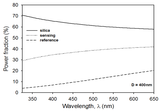 The change of the power fraction in the different regions of the sensing arm has been studied and is presented in Figure 5.7. As can be seen from the characteristics, shown in Figure 5.7, when the wavelength increases, the mode is weakly confined, and hence, less power is seen in the core region and more power is present in the cladding aqueous region. The mode is well confined for smaller wavelength values and more power is present in the core silica region. However, as the wavelength increases, the mode becomes weakly confined and more power is present in the aqueous solution region compared to the silica core region.