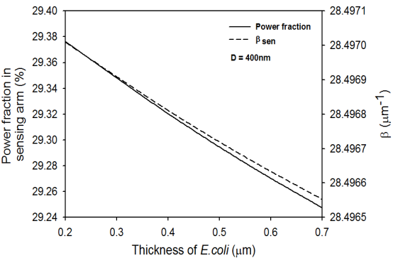 Next, the change in the propagation constant β of sensing arm and the power fraction in the aqueous solution of sensing arm as a function of the E.Coli thickness, for a core diameter of D = 400 nm, have been investigated and are presented in Figure 5.8. As the E.Coli thickness increases, both the propagation constant and the power fraction in the sensing arm decrease linearly.