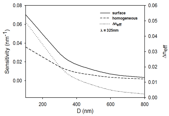 When designing a sensor, the sensitivity is a very important parameter to evaluate the device performance. To study the sensitivity of our device, we use the sensor to detect the change in the effective index of mode with the change in the refractive index of surrounding medium. When there is an extremely small index change around the nanowire, the guided light is changed in its optical phase. We assumed the sensing area length, L = 75µm. Calculated Δneff is about 0.0131/μm at the wavelength of 325 nm induced by coating the nanowire with E.coli layer for a 400nm diameter silica nanowire.