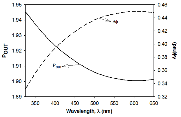 In all variation of the wavelength, Δφ ≠ 0, this is caused by the deposition of a biolayer around the sensing arm, therefore, the optical output power is different too in all variation of the wavelength.