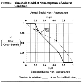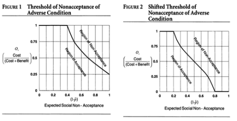 This diagram implies that there is wide gap between private cost-benefit assessment and public positions. The stable equilibria level indicated may alter to change in factual data made available by media, political leaders. Problem reevaluation occurs in an interspersed manner due to the swift shift from point of equilibria to another. Testing the applicability of such models is difficult because of exact data requirements aggregate data may be used to analyze to crossing of the threshold levels of non-acceptance. The importance of the feedback mechanism has also been indicated.
