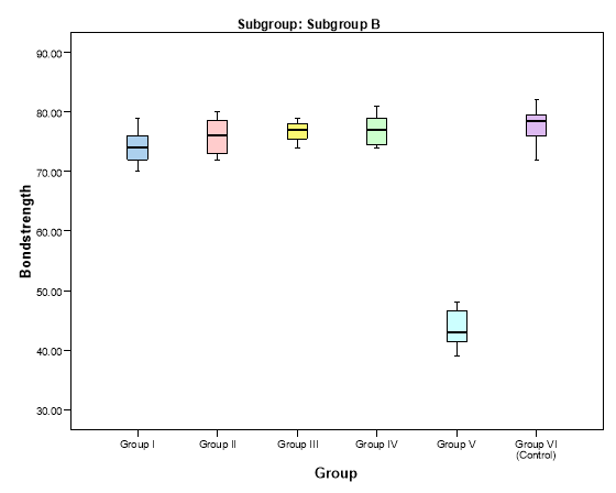 Bond strength of Subgroup IIB (76.75+1.75 units) was found to be higher than Subgroup IIA (64.75+2.12 units) and this difference was found to be statistically significant (p<0.001).