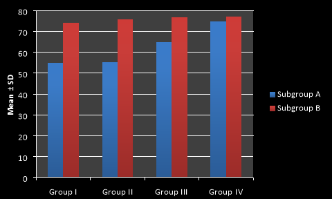 Analysis of variance and box plot thereafter revealed statistically significant intergroup differences (p<0.001). Values in Group V were of lower order while values in Groups IVA and VI were of higher order. Values in groups IA, IIA and IIIA were of middle order.