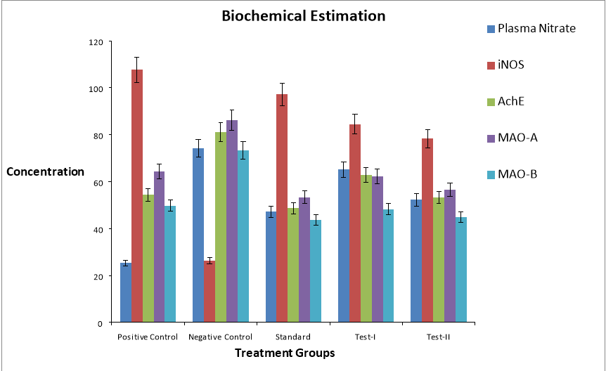 Biochemical Estimations show following result: Plasma nitrates level, Ach level, MAO-A level, MAO-B level, Glutathione reductase level was significantly decreased after administration of Semecarpus anacardium at dose of 200 mg/kg as compared with negative control. iNOS level was significantly increased after administration of Semecarpus anacardium at dose of 200mg/kg as compared with negative control.