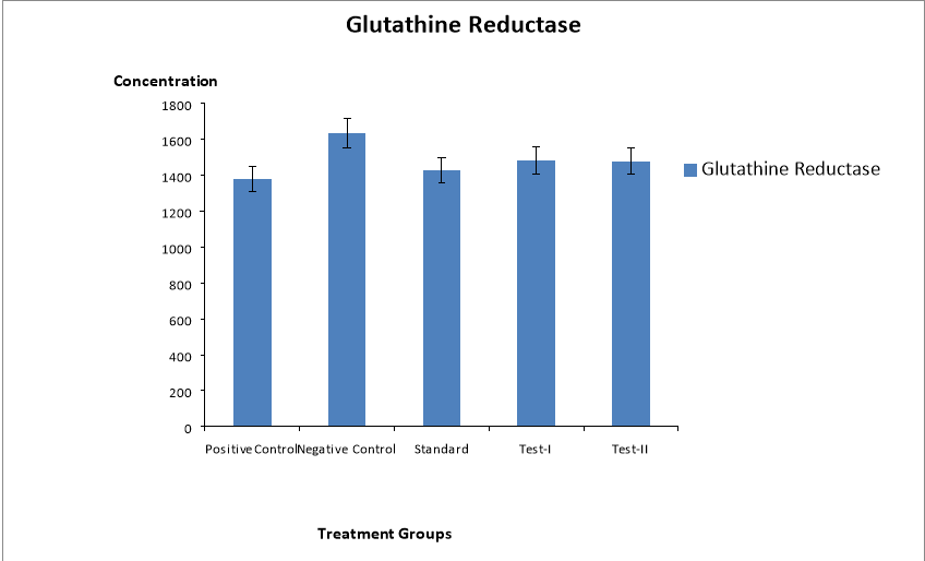 Glutathione reductase level was significantly decreased (P>0.001) after administration of Semecarpus anacardium at dose of 200mg/kg (1478.5±3.2436 sec.) as compared with negative control (1634±2.2102 sec.). All values are expressed in U/I. Glutathione reductase level was decreased after administration of extract of Semecarpus anacardium at dose 200 mg/kg in mice. Glutathione reductase is the enzyme which increases in anxiety and depression. This enzyme secretes from hippocampus region of brain. The level of this enzyme was significantly reduced in mice compared with vehicle treated control group.