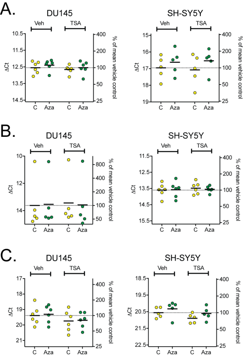 Following the overnight plating, DU-145 and SH-SY5Y cells were treated by replacing the old medium with a fresh layer of medium containing Aza dC (1 µM), Trichostatin A (25 nm), a combination of both, or vehicle (DMSO 0.1%) as control for 24 h. After 24 h hours, cells were lysed according to the Dynabeads® mRNA DIRECT„¢ Purification Kit (Thermo Fisher Scientific, Waltham, MA, USA) instructions and mRNA was extracted.