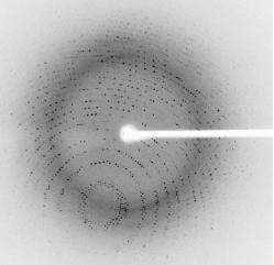 The orthorhombic crystals belonged to space group P212121 and diffracted to 2.51 Å resolution at 103 K (one of the oscillation images is shown in Fig. 3); data-processing statistics are mentioned in Table 1. The unit cell parameters were a = ,b= ,c= Å. A total of 1063508 reflections were collected, of which 50257 were unique; the completeness of the diffraction data was 99.1 %. Assuming the presence of four monomeric molecules (with a calculated molecular weight of 36,495 Da each) per crystal asymmetric unit, the calculated Matthews coefficient and solvent content are 2.51 Å3 Da-1 and 51.1%, respectively (Matthews, 1968).