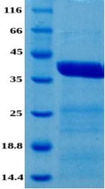 Full-length gapdh protein with a N-terminal 6X-His tag was expressed from the plasmid pET28a-gapdh and purified using metal affinity chromatography. The purity of sample was assessed using 15% commasive stained SDS-PAGE (Fig. 2). The identity of protein was confirmed through MALDI analysis.