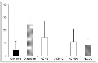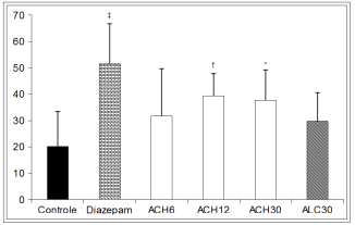 A complementary parameter used to evaluate whether the response of the rats indicates anxiolytic effects of the investigated treatments is the number of entries in the closed arms . In this study, it exhibited significant difference in the groups treated with Acon 12CH and 30CH and the positive control diazepam (Figure 3). These results suggest that the anxiolytic effect did not interfere with the mobility of the animals in the EPM.