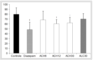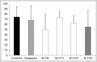 Methodolgy: 48 adult Wistar rats (Rattus rattus) ranging from two to three months old were divided randomly into six groups. Each group received its corresponding treatment daily for 10 consecutive days: 1) control (diazepam 1 mg/kg/day); 2) negative control (0.15 mL saline solution/day); 3) ACH6 (0.15 mL Acon (6CH/day); 4) ACH12 (0.15 mL Acon 12CH/day); 5) ACH30 (0.15 mL Acon 30CH/day); and 6) ALC30 (0.15 mL 30% cereal alcohol/day). The same person at the same time each day administered respective treatments by a gastric tube. Behavioural effects were blindly and randomly assessed one hour after treatment on the 10th day. Animals were subjected only once to each pharmacological model; an elevated plus maze (EPM) and open field test.