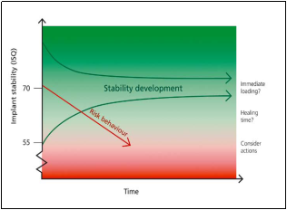 This graph illustrates the progress of implant stability over time, expressed in ISQ terms. The converging green curves show the two most likely scenarios: implant stability eventually sets at around 70 ISQ. A high initial ISQ value tends to decrease, as mechanical stability is supplanted by osseointegration. And a low initial value tends to increase, as osseointegration sets in. The scenario to watch out for is illustrated by the red curve. Here, osseointegration is not progressing as planned, and loading such an implant may result in a failed treatment… High initial stability (ISQ values of 70 and above) tends not to increase over time despitethe fact that the initial high mechanical stability decreases and is replaced by increased biological stability. Lower initial stability normally increases with time because the lower mechanical stability is increased by the bone remodeling process (osseointegration). Values of ISQ 55 or lower should be taken as a warning sign and actions to improve the stability should be considered (larger implant diameter, longer healing time, etc.)* *(Implant stability measurements using Resonance Frequency Analysis. Biological and biomechanical aspects and clinical implications. Periodontology 2000, 2008. Sennerby & Meredith)