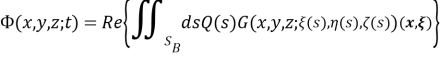Equation 8 expresses the source potential is a summation of a source in infinite fluid and an image sink above free surface when . This satisfy the free surface condition where velocity potential equal zero on . Therefore, the solution of the velocity potential for a problem (e.g. force heave) can be written as