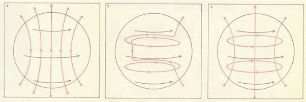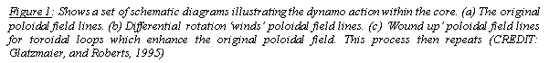 Our current theories of the origins of the Earth’s magnetic field rely on the understanding of the geodynamo processes occurring within the core. Differential rotation is a requirement for the geodynamo to exist. It is this differential rotation that drives the dynamo action by generating toroidal magnetic fields from poloidal. Initially, there are poloidal field lines, which are then ‘wound up’ by the differential rotation (shown in figure 1). Only a small amount of diffusion is needed to break these poloidal lines and form a toroidal loop, and these new toroidal field lines then amplify the original poloidal field, and the process repeats.